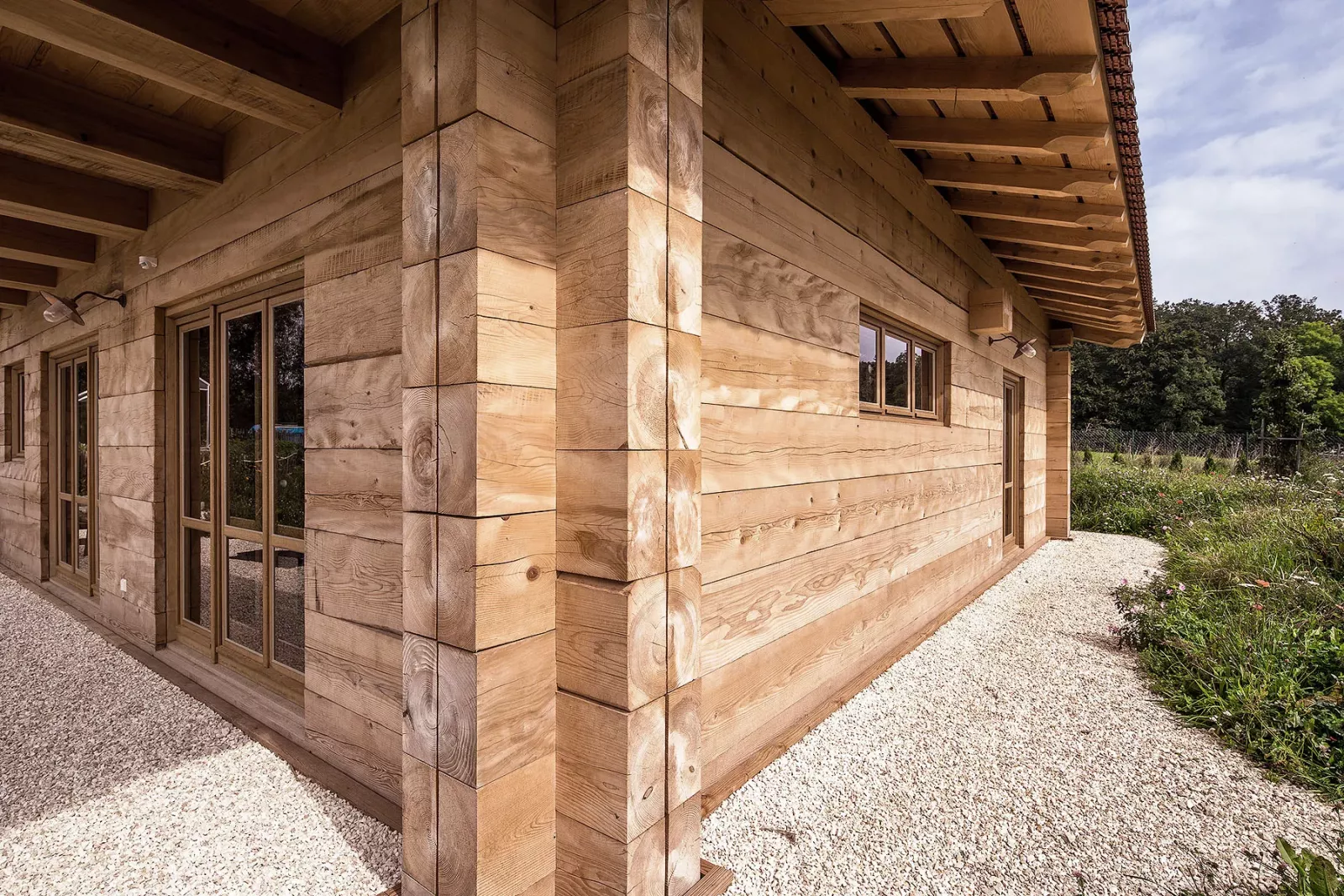 Neubau Einfamilienhaus von Duffner Blockbau mit Balken aus heimischer Weisstanne in 38 cm Profilbreite.