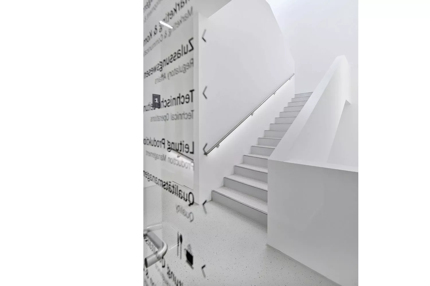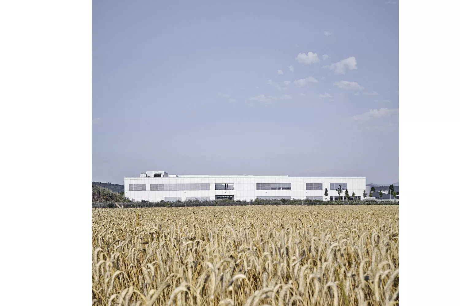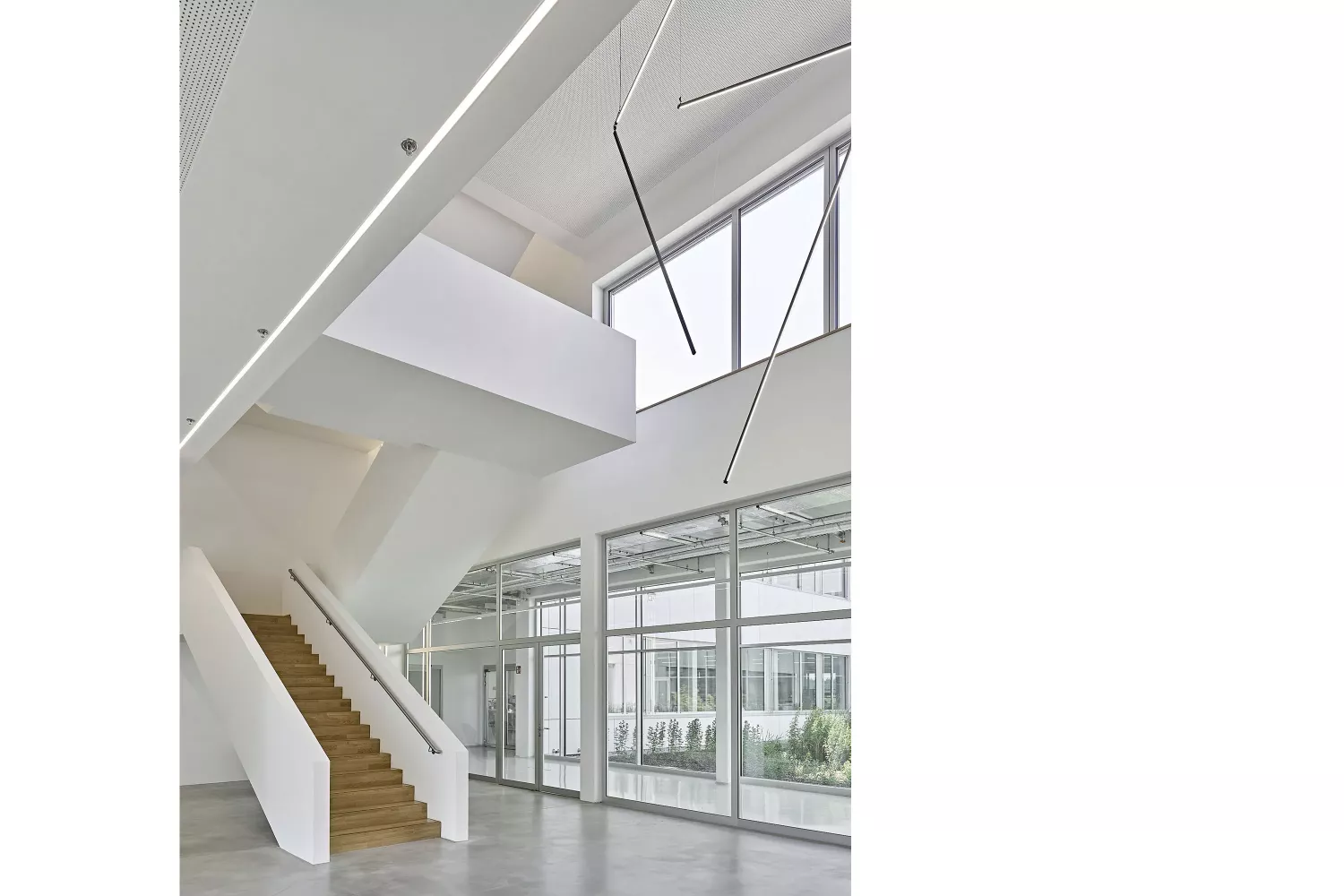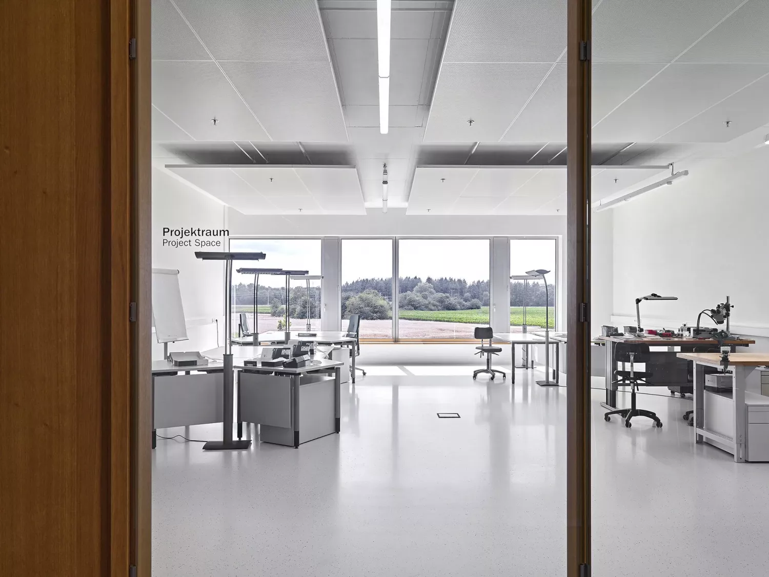 Neubau der Firmenzentrale mit Integration von Verwaltung, Entwicklung und Produktion in ein architektonisches Gesamtkonzept.