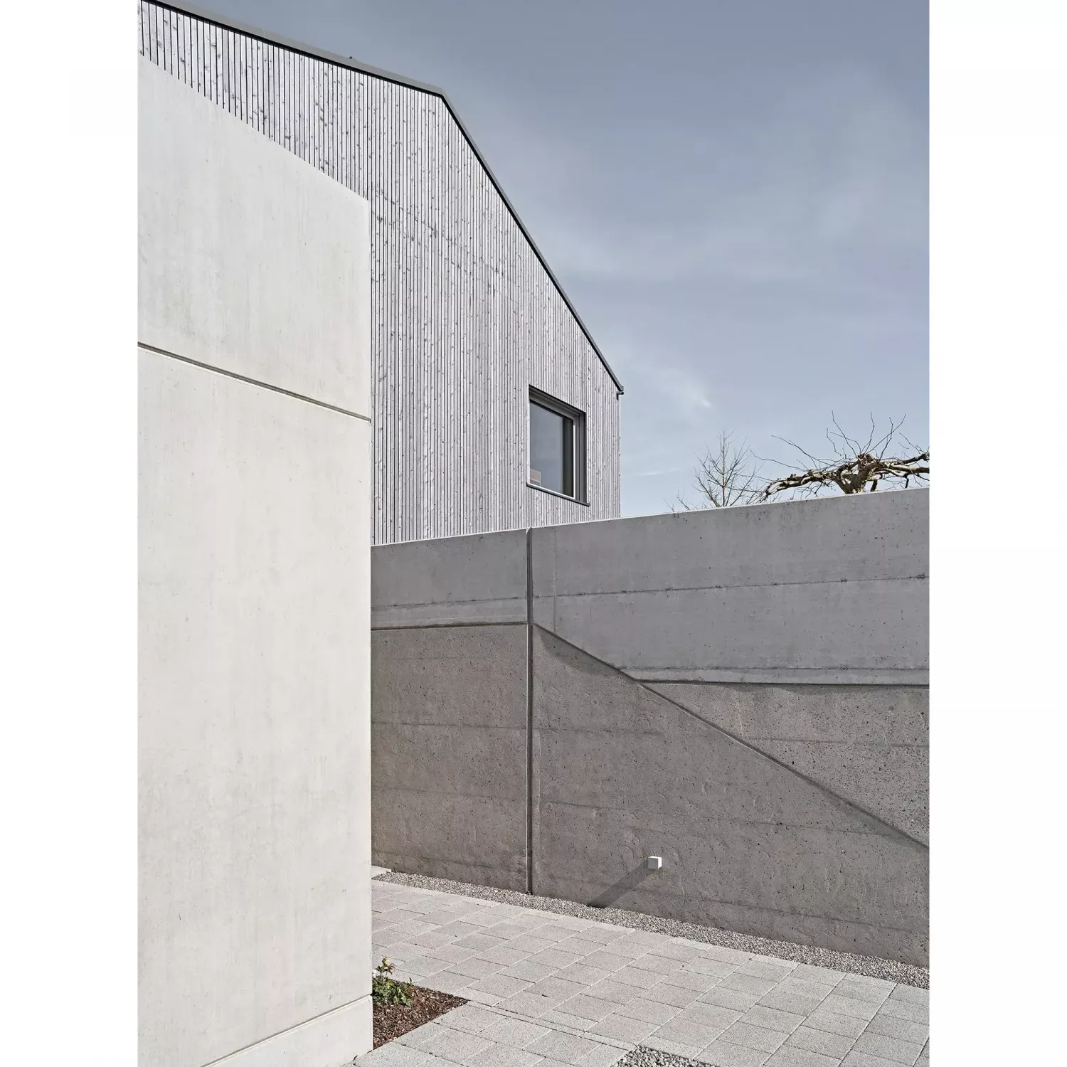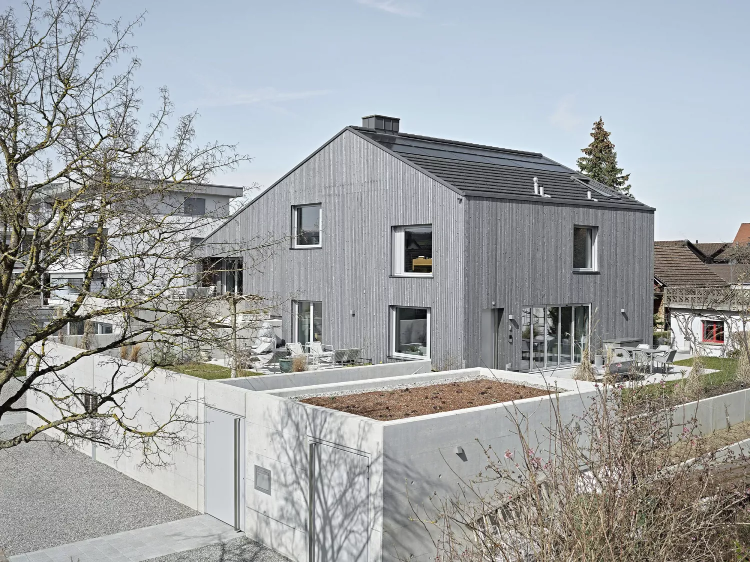 Das ehemals zur Straße bepflanzte abschüssige Grundstück wurde mit neu errichteter Mauer bewehrt, die Zugänge und Funktionen zoniert und private Gartenräume ermöglicht. Fertigstellung 2022.